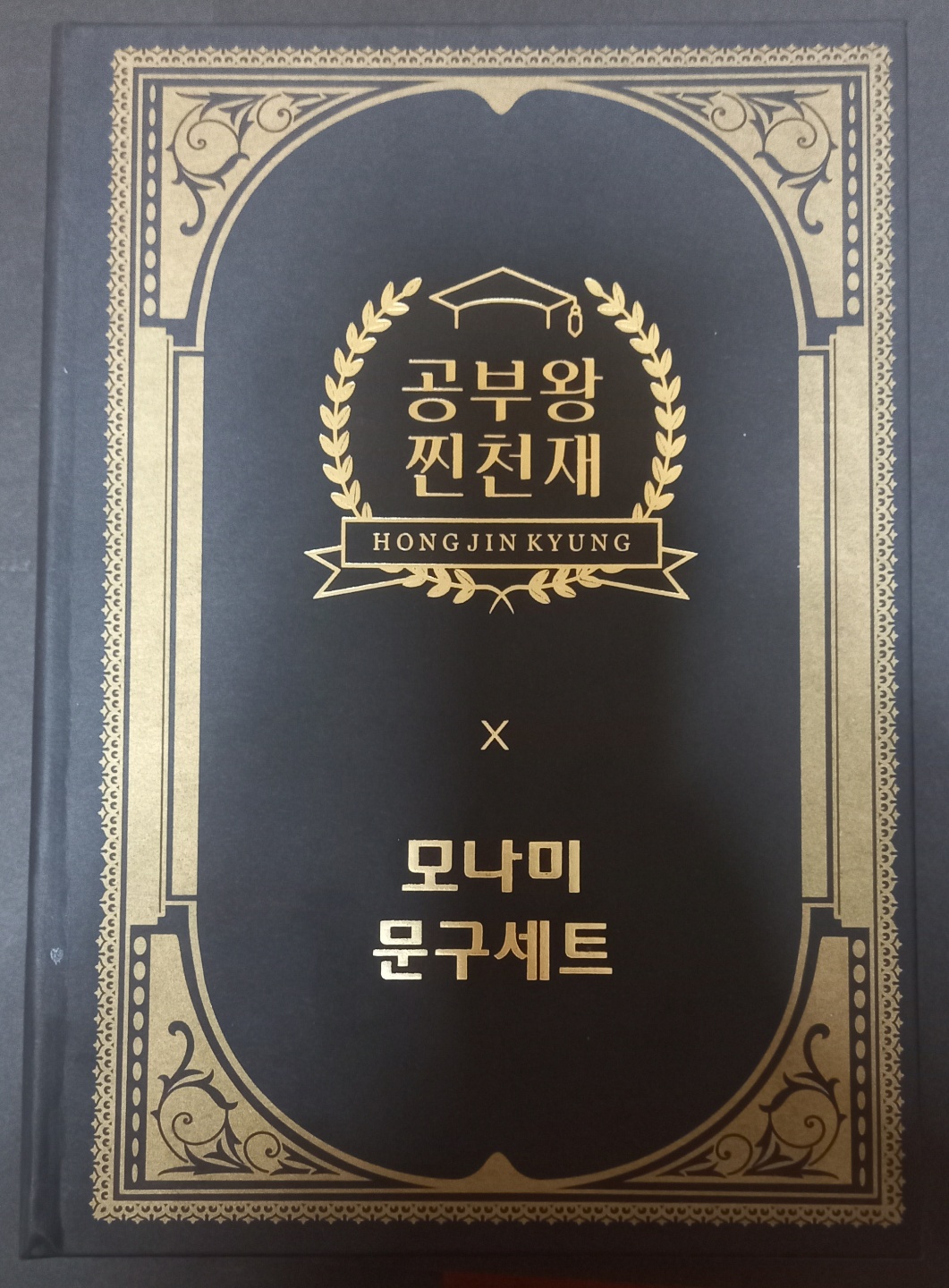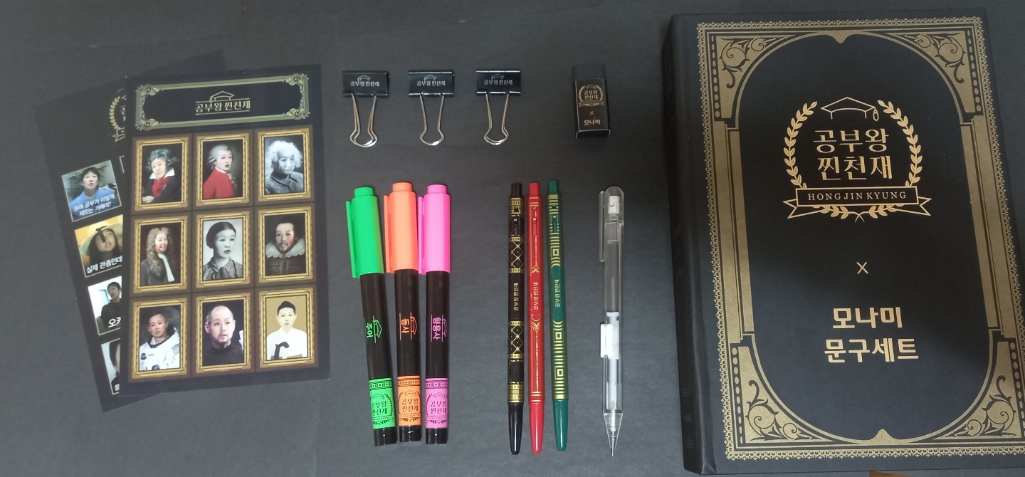 유튜브 알고리즘을 타며 자유롭게 돌아다니던 중 '공부왕 찐천재'라는 유튜브 채널에 정착하게 되었다. 알고리즘이 처음 소개해 준 것은 '[인수분해] 대한민국 원탑 강사 '정승제'에 홀딱 반한 홍진경 (수포자 필독, eng)'라는 제목의 영상이었다. 요즘 친구가 정승제쌤의 강의가 재밌다고 하도 얘기를 많이 해서 그런지 반가운 마음에 영상을 시청하게 되었다. 정승제쌤이 인수분해를 쉽게 강의해 주는데 사실 강의 내용보단 출연자분들(특히 홍진경)이 너무 웃겨서 계속 보게 된 것 같다. 여러 가지 영상을 찾아보던 중 공부왕 찐천재의 굿즈가 나왔다는 소식을 들었고, 나는 아무 생각 없이 바로 결제를 했다. 그리하여 온 굿즈가 바로 오늘 내가 리뷰할 공부왕 찐천재와 모나미가 협업으로 제작한 문구 세트이다.